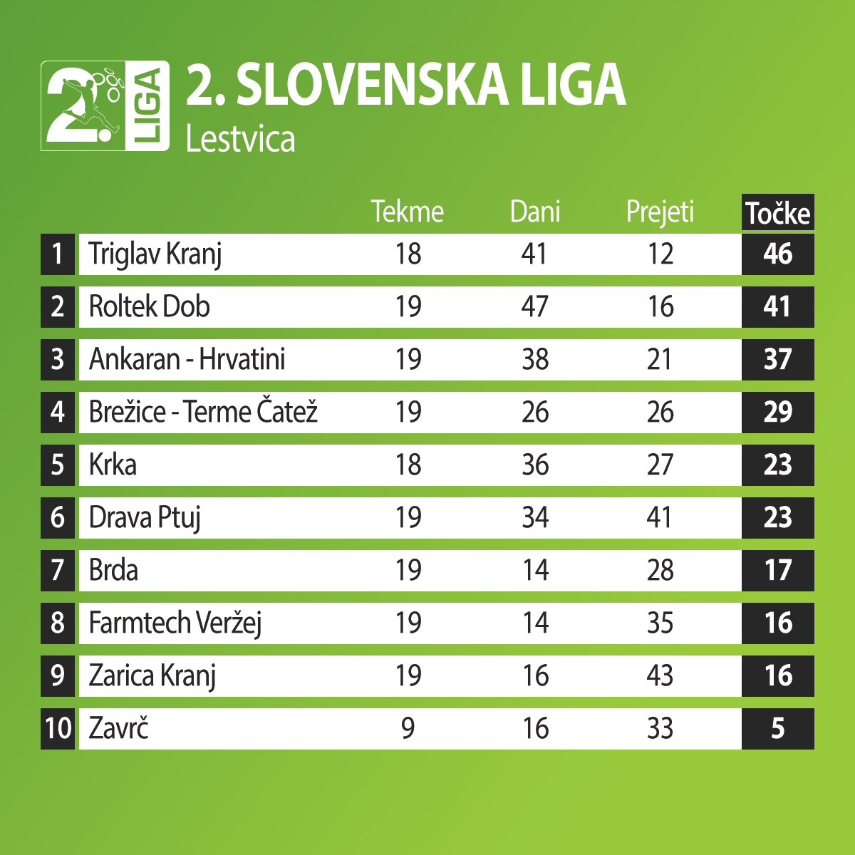 Triglav ima po novem le še pet točk prednosti pred Dobom, ki pa je odigral tekmo več od Gorenjcev. Zelo zanimivo je pri dnu prvenstvene lestvice, kjer ena sama točka loči ekipe Brd, Farmtech Veržeja in Zarice.