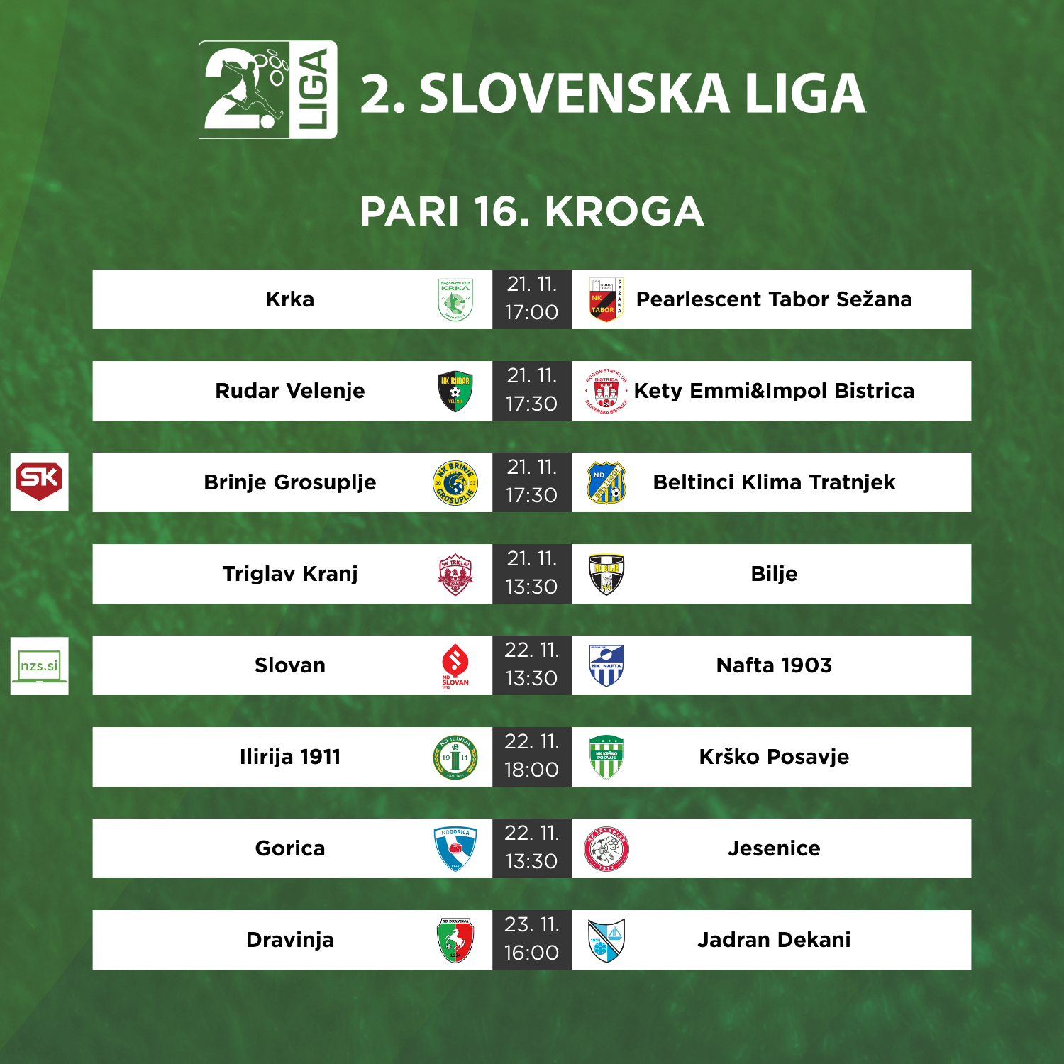 Drugoligaši bodo jesenski del sezone zaključili s tekmami 16. kroga. Nafta 1903 bo prvo mesto branila na gostovanju pri Slovanu, dvoboj s Kodeljevega pa bo pospremila tudi kamera NZS. V derbiju kroga se bosta pred kamerami Sportkluba udarila drugo Brinje in tretji Beltinci.