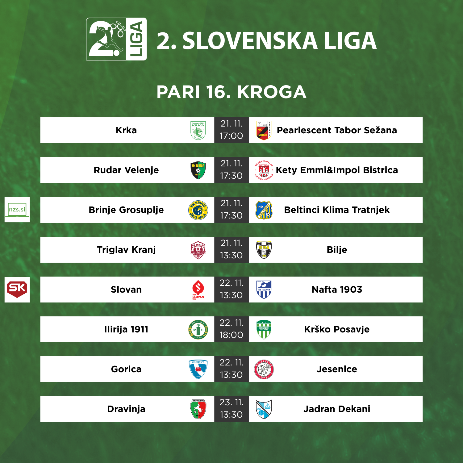 Drugoligaši bodo jesenski del sezone zaključili s tekmami 16. kroga. Nafta 1903 bo prvo mesto branila na gostovanju pri Slovanu, dvoboj s Kodeljevega pa bodo pospremile tudi kamere Sportkluba. V derbiju kroga se bosta pred kamero NZS udarila drugo Brinje in tretji Beltinci.