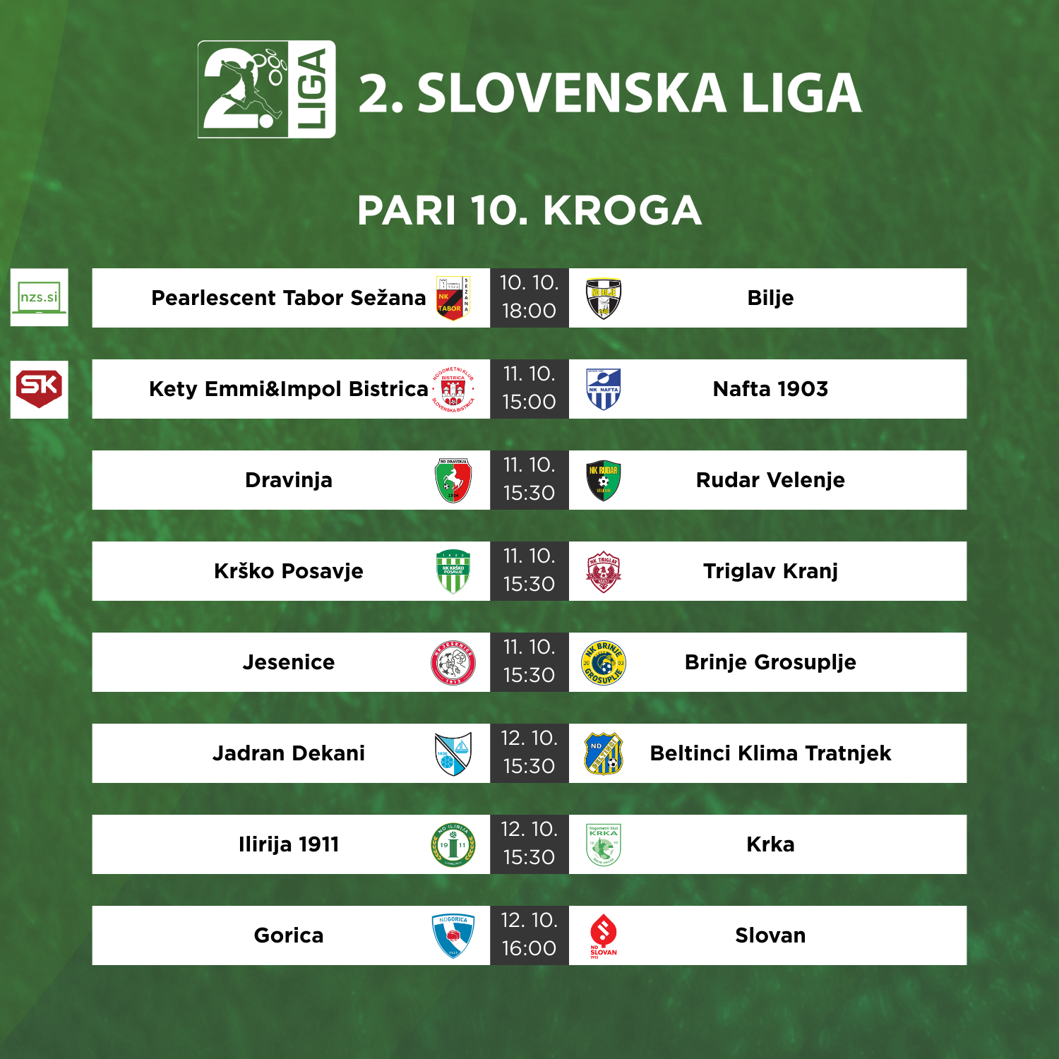 Zadnja tekma kroga bo odigrana v Novi Gorici, četa Oliverja Bogatinova bo pričakala zasedbo Slovana. Tako Goričanom kot Ljubljančanom v zadnjih tednih ne gre po načrtih. Primorci neuspešno lovijo prvo zmago sezone, po porazu v Kranju pa so se s štirimi točkami znašli v coni izpada. Se lahko na lestvici pomaknejo višje po desetem krogu 2. SNL? Slovan je klonil na zadnjih treh preizkušnjah, ekipa s Kodeljevega pa je postala idealen tekmec za klube, ki lovijo prvo zmago sezone. V sedmem krogu so se na tekmi z rdečimi prvič v sezoni veselili Velenjčani, krog zatem je podoben dosežek uspel Novomeščanom, pred dnevi pa še Konjičanom. Bodo negativno serijo Slovana podaljšali tudi Goričani? V lanskoletni sezoni so obe medsebojni tekmi dobili Ljubljančani.