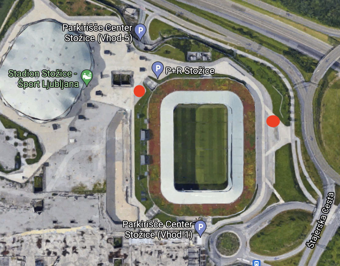 Testiranje na stadionih na dan tekme (rdeče točke):