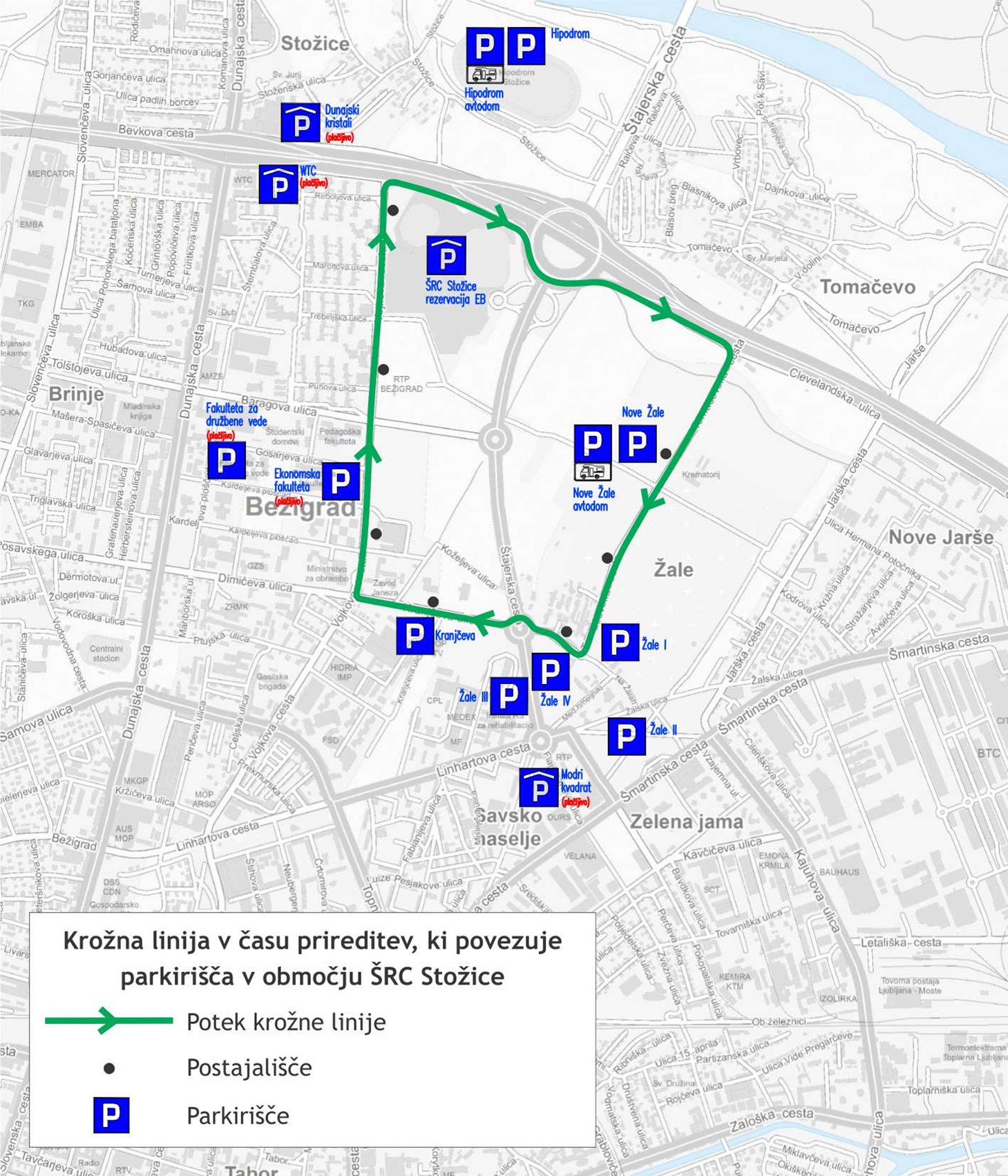 Vojkova – Cesta Janeza Porente – part of the roundabout – Clevelandska – Tomačevska – Kranjčeva – Vojkova – Stožice Centre.