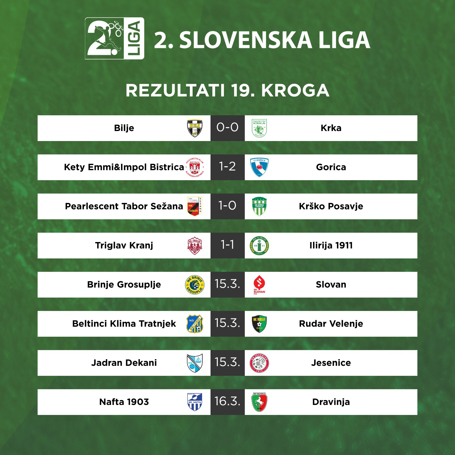 Biljenci so niz petih zaporednih porazov prekinili v obračunu s Krko, dvoboj Primorcev in Dolenjcev pa ni ponudil zmagovalca. Tekmeca sta se razšla z začetnim rezultatom, bilo je 0:0, Krka je na svoj račun dodala 19. točko, Bilje so zbrale dve točki več.