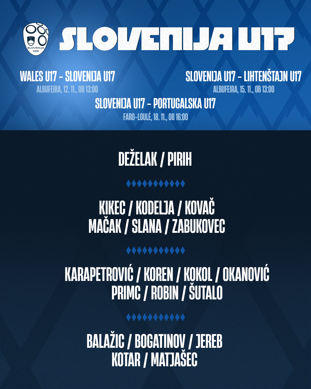Mladi Slovenci se bodo na skrajnem jugu Portugalske merili z reprezentancami Walesa, Lihtenštajna in Portugalske, selektor Muamer Vugdalić pa bo ekipo zbral 8. novembra v Mariboru. Valižani bodo prvi nasprotniki slovenskih fantov, tekma v Albufeiri se bo v sredo, 12. novembra, pričela ob 13. uri. Tri dni zatem, bo na istem prizorišču in ob isti uri odigran še dvoboj z Lihtenštajnom. Domačini Portugalci bodo Slovence 18. novembra gostili v Faro-Louleju, srečanje pa se bo začelo ob 16. uri.
