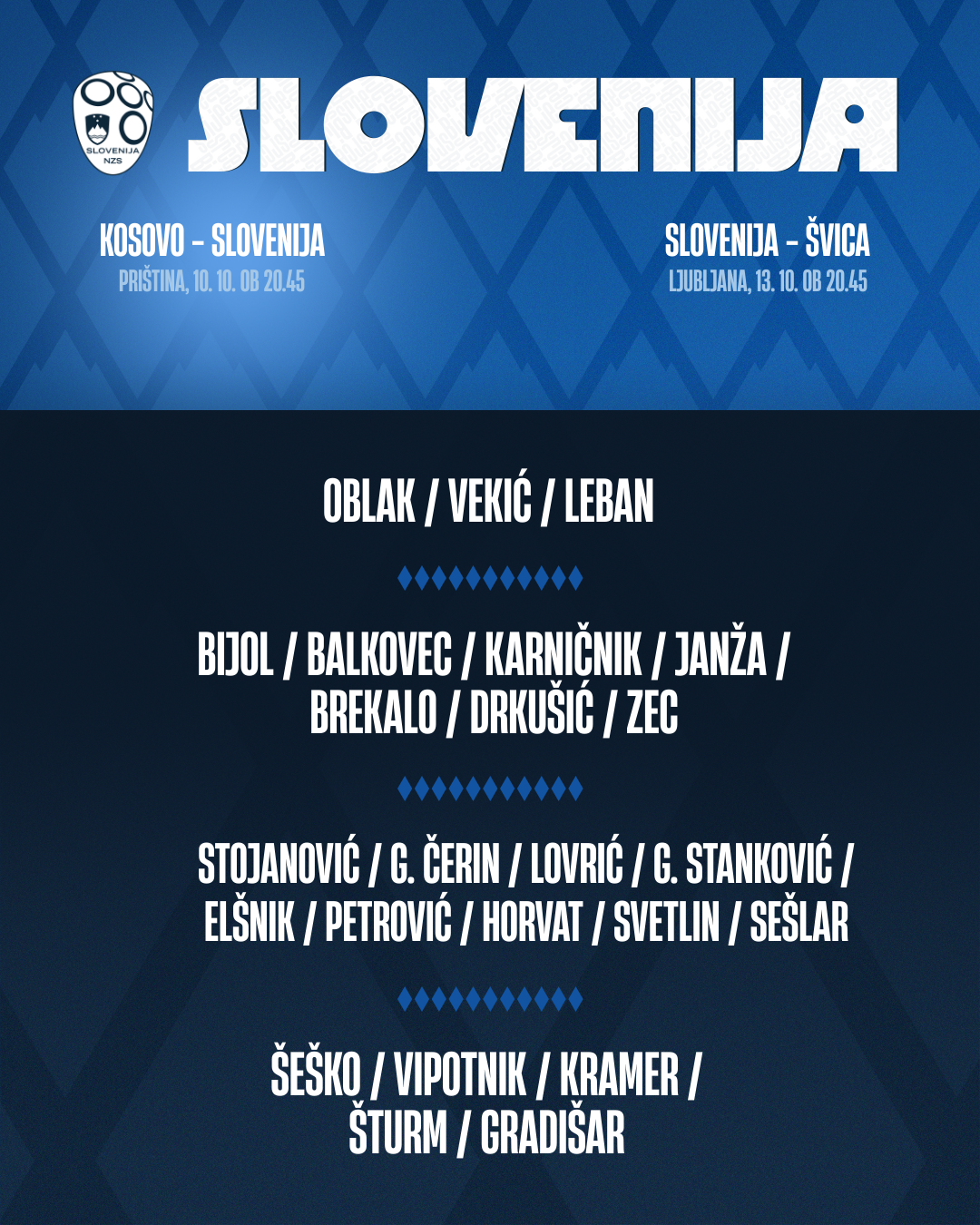 Selektor slovenske nogometne reprezentance Matjaž Kek je na današnji novinarski konferenci v Nacionalnem nogometnem centru Brdo predstavil seznam vpoklicanih nogometašev za tekmi s Kosovom in Švico. Slovenija bo gostovala v Prištini 10. oktobra ob 20.45, medtem ko bo domača tekma s Švico 13. oktobra ob 20.45 v Stožicah.