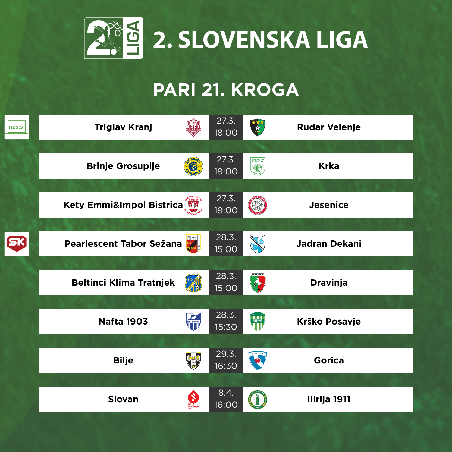 Z 21. krogom se začenja zadnja tretjina 2. SNL. V primorskem obračunu se bodo pred kamerami Sportkluba pomerili Sežanci in Dekančani, vodilni Grosupeljčani pa bodo v dolenjskem spopadu gostili Novomeščane. Bilje se bodo v sosedskem dvoboju udarile z Gorico.