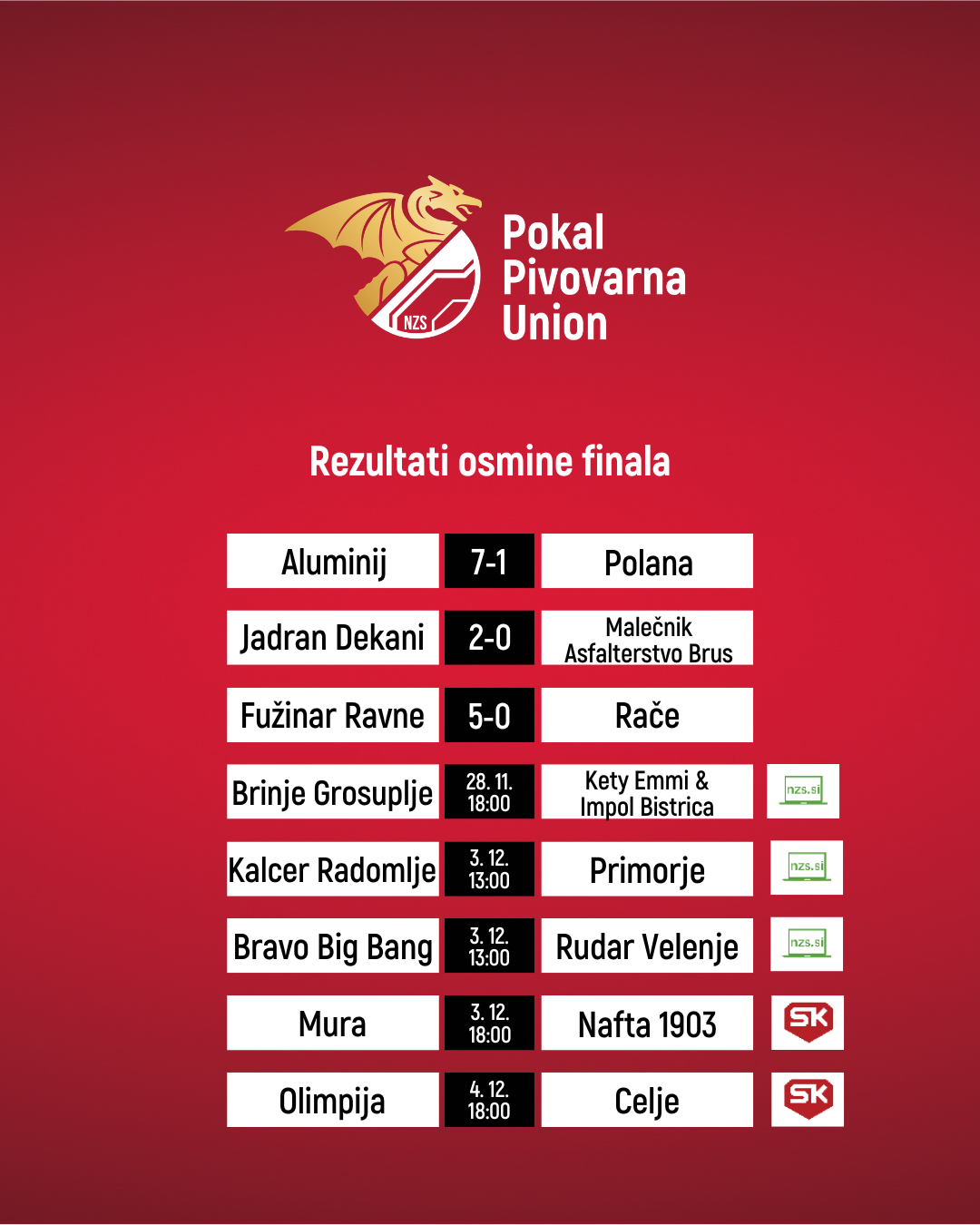 Druga polovica sporeda osmine finala Pokala Pivovarna Union bo odigrana v začetku decembra. Tudi na peti tekmi bosta nasprotnika ligaška znanca, Radomljani bodo na domačem igrišču pričakali Ajdovce. Primorje je v letošnji sezoni izgubilo obe medsebojni tekmi z "mlinarji", ki so bili v prestolnici burje z golom Nina Kukovca boljši z izidom 1:2, še prej pa so v Domžalah slavili s 3:1. Z istim rezultatom se je končal tudi pokalni obračun Beltinčanov in Radomljanov, medtem ko so rdeče-črni v primorskem obračunu s Taborom zabili še zadetek več. Kdo si bo v decembru zagotovil nadaljevanje pokalne poti?