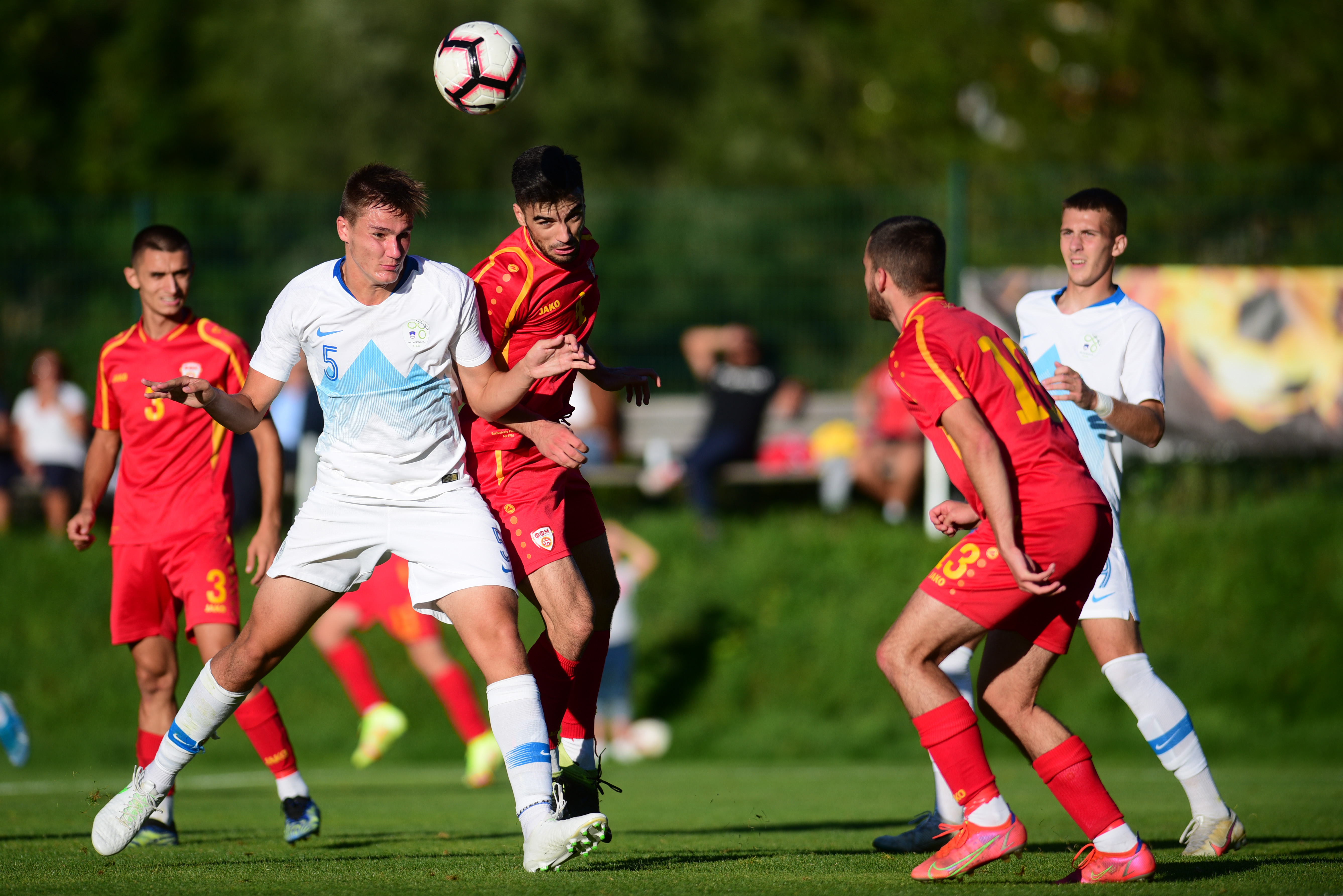 Dvoboj v Kranjski Gori se ni pričel po željah Slovenije. Severni Makedonci so po napaki slovenske obrambe povedle po malce več kot treh minutah igre. Slabo podajo Sama Matjaža je izkoristil Dasmir Elezi in sam pred vratarjem Samom Pridgarjem zadel za vodstvo. Slovenska mreža se je v 22. minuti tresla še drugič, po kotu z leve strani igrišča je bil ob bližnji vratnici najvišji Vane Krstevski.