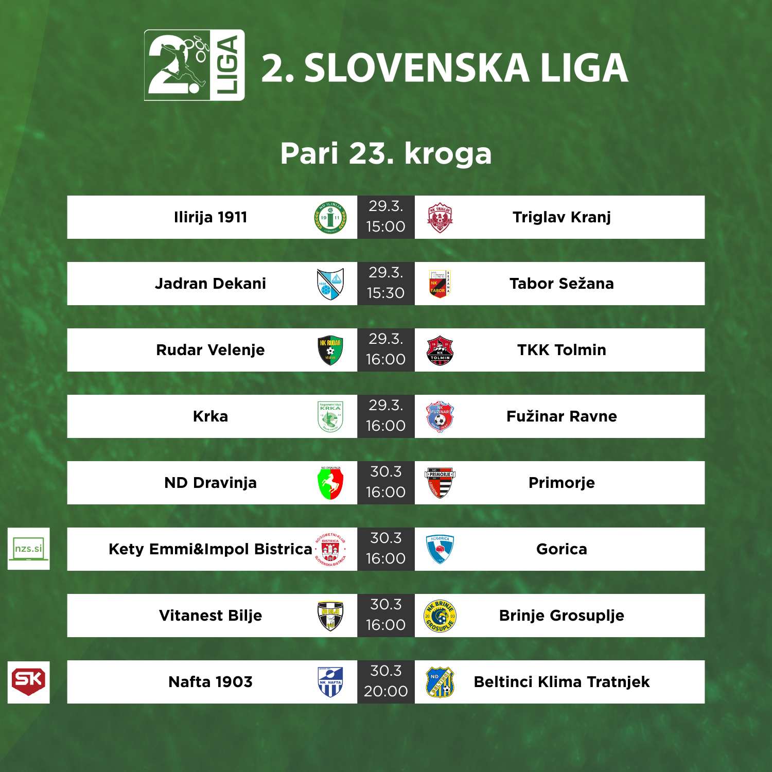 Dogajanje v 23. krogu prvenstva bodo s tekmo v Ljubljani odprli nogometaši Ilirije in Triglava. Zasedba iz Šiške še čaka na prvo spomladansko zmago, Ljubljančani pa po dveh remijih v nadaljevanju sezone ostajajo na mestu, ki ne zagotavlja obstanka. Kranjčanom gre v letošnji sezoni precej bolje, so pa orli z zadnjim porazom povečali zaostanek za vrhom lestvice. Drugouvrščeni Beltinčani zdaj bežijo za sedem točk, lahko Gorenjci razliko zmanjšajo vsaj do sobotnega večera? Septembrski dvoboj v Kranju se je končal z začetnim rezultatom, Triglav pa je doslej dobil zgolj eno od petih medsebojnih tekem v 2. SNL.