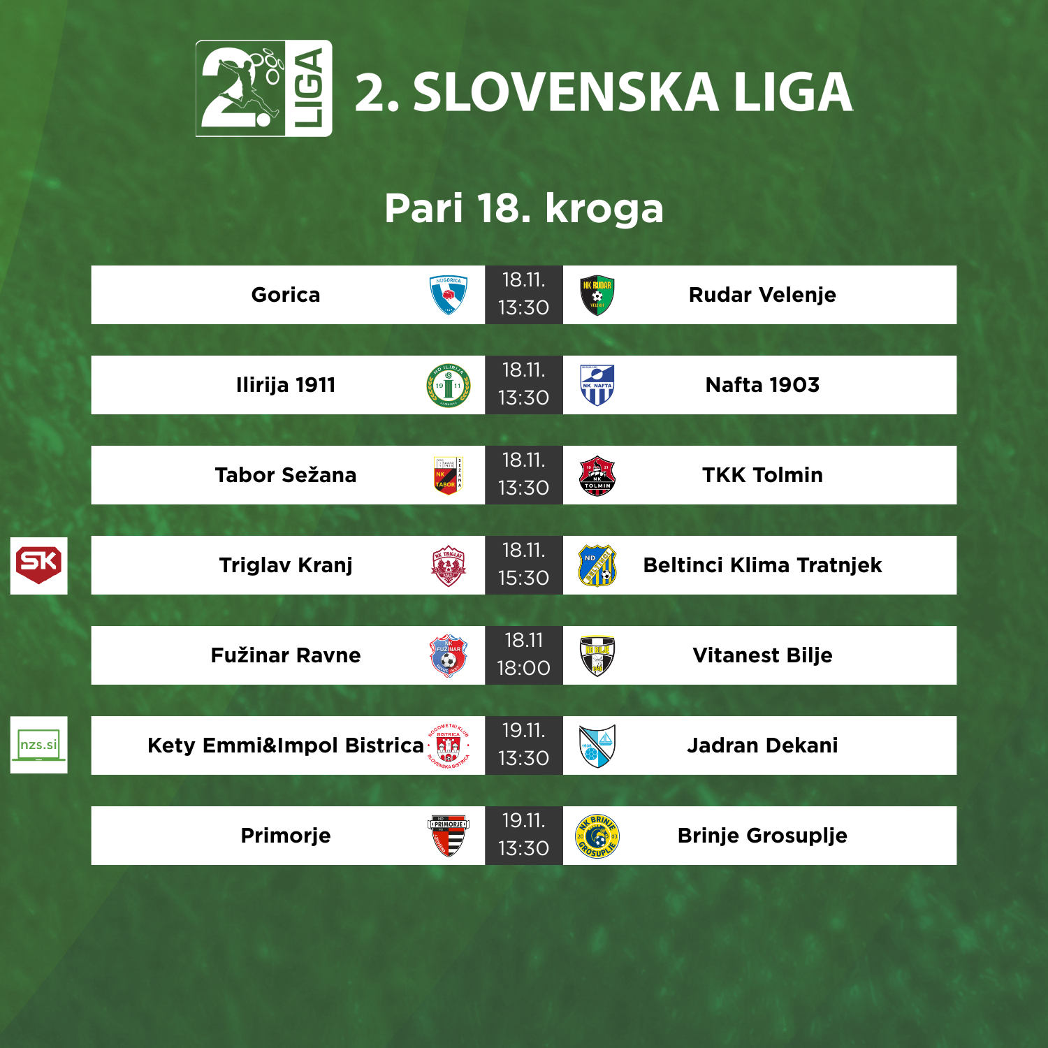 Drugoligaši se bodo s tekmami 18. kroga poslovili od jesenskega dela prvenstva. Nafta bo vrh lestvice branila v Ljubljani, pred kamerami Sportkluba pa se bodo srečali peti Kranjčani in drugi Beltinčani. Na spletni strani NZS si boste lahko ogledali nedeljski dvoboj Bistrice in Dekanov.
