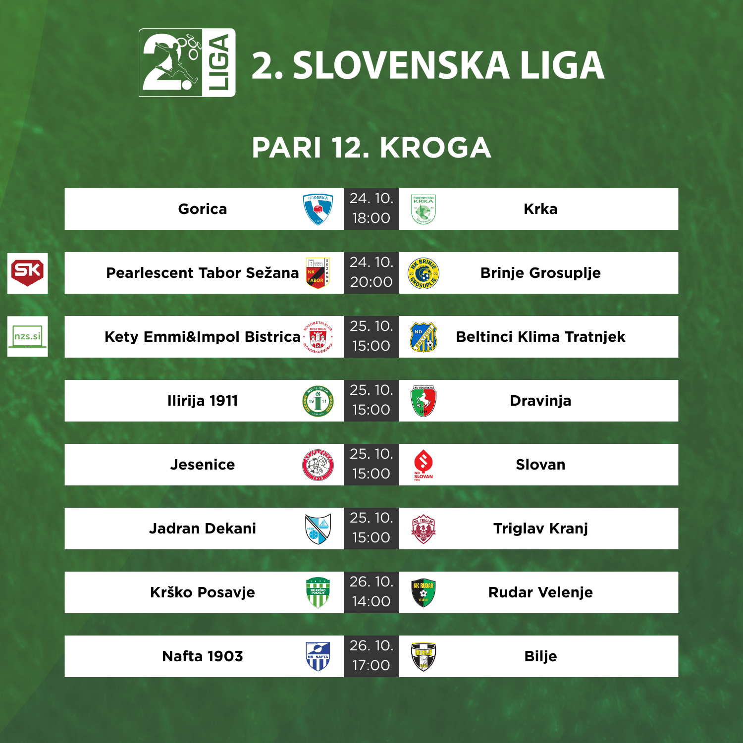 Dvanajsti krog 2. SNL bosta z dvobojem začelja lestvice odprli ekipi Krke in Gorice. Tako Novomeščani kot Goričani ne morejo biti zadovoljni z dosedanjim potekom sezone, saj so Dolenjci slavili zgolj enkrat, s petimi remiji pa so nabrali osem točk. Še slabše gre Gorici, ki se s tremi točkami manj nahaja v coni izpada. Nekdanji državni prvaki še čakajo na prvo zmago sezone, pritisk pa je z daljšanjem zmagovalnega posta vse večji, polovica sezone pa vse bližje. Goričani se bodo na domačem igrišču pobirali po porazu v Velenju, Novomeščani pa bodo skušali podaljšati serijo neporaženosti, ki po prihodu Aleša Kačičnika traja že pet tekem. "Farmacevti" pod taktirko novega stratega še ne poznajo poraza, a za boljšo oceno manjka še kakšna zmaga več. Krka je v prejšnjem krogu remizirala z Dravinjo, ki je sicer na Portovalu vodila že z 2:0. Točko sta v drugem polčasu priigrala Dominik Iskrić in Žan Kovačević.