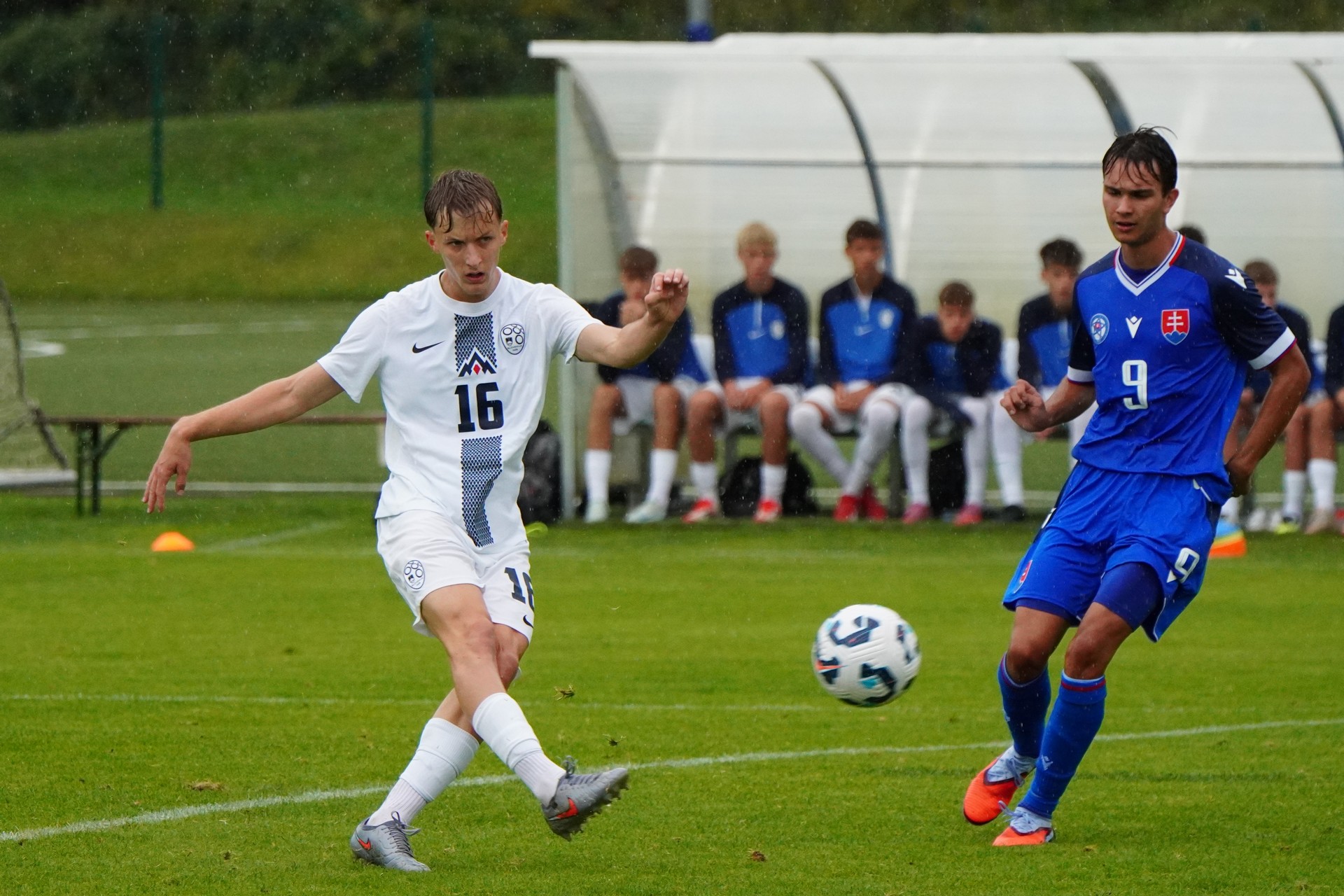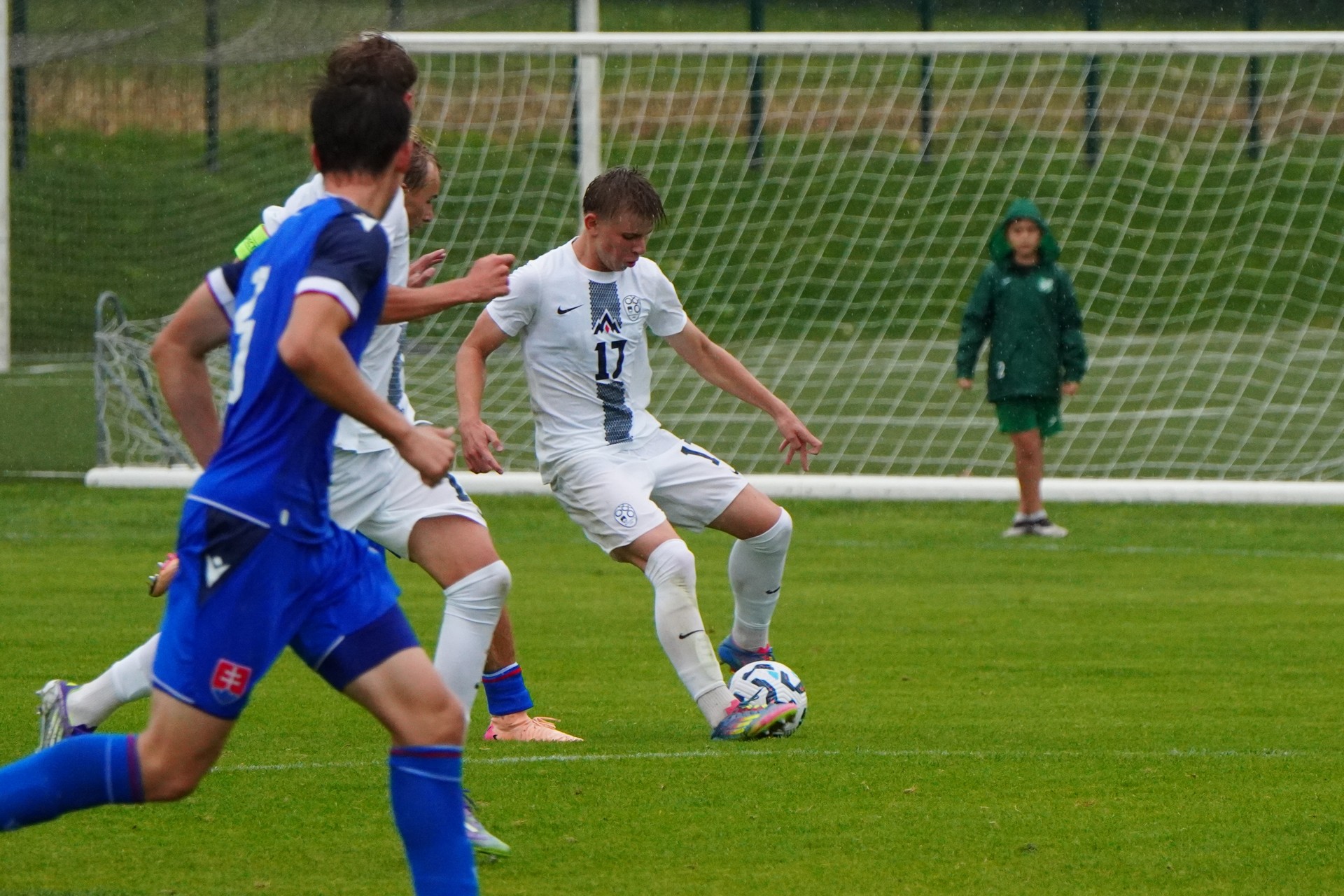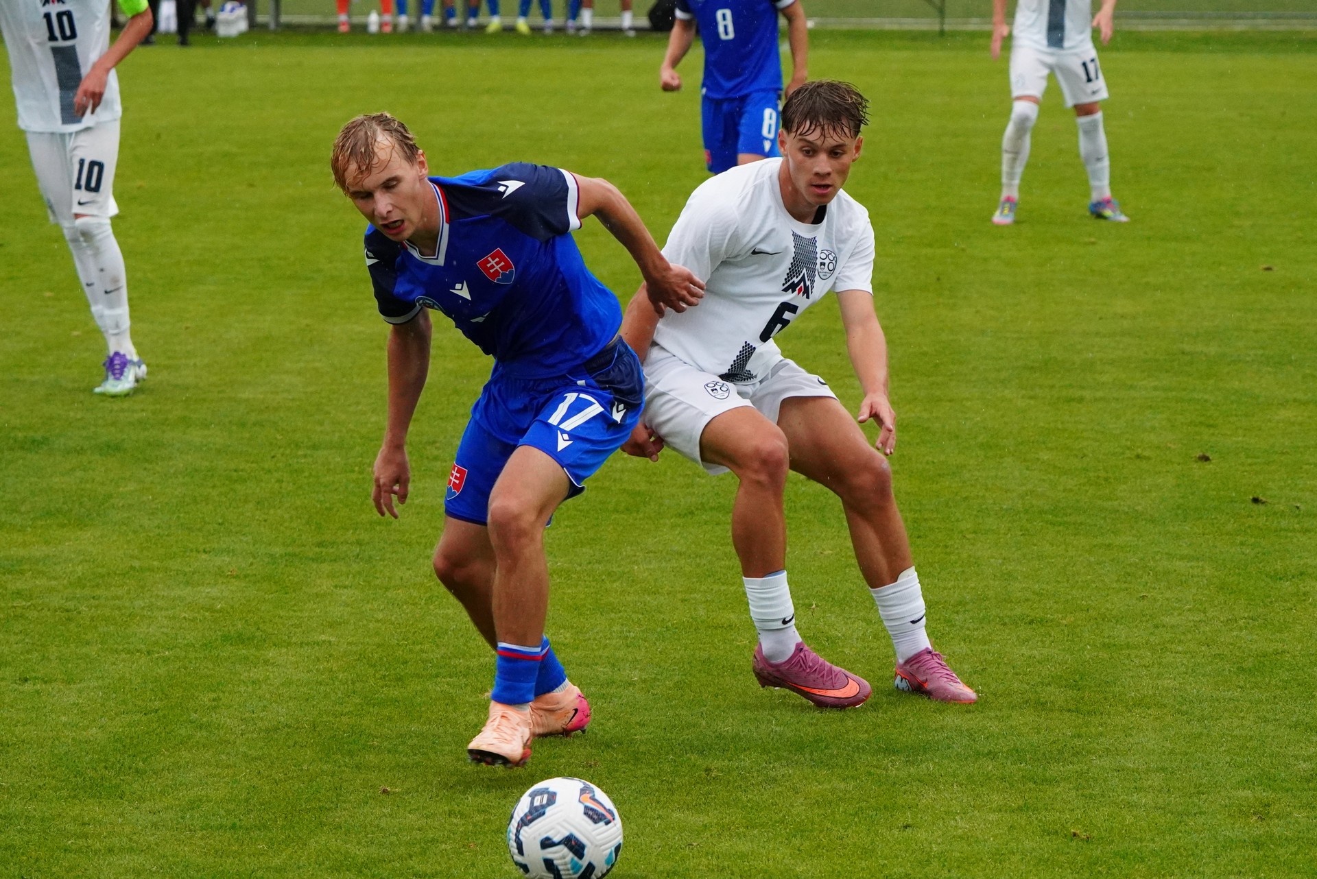 Slovaki so bili po napaki slovenske obrambe nevarni že v uvodni minuti, po strelu Lea Hofstadterja pa se je izkazal vratar Rene Pirih. Gostitelji srečanja so odgovorili v četrti minuti. Po predložku Tristana Kotarja je z glavo poskušal David Jereb, veselje pa mu je preprečil Dušan Perniš. Slovenija se je v zaostanku znašla v 12. minuti, ko so gostje prišli do kazenskega udarca, izkoristil pa ga je Matuš Tomaško.