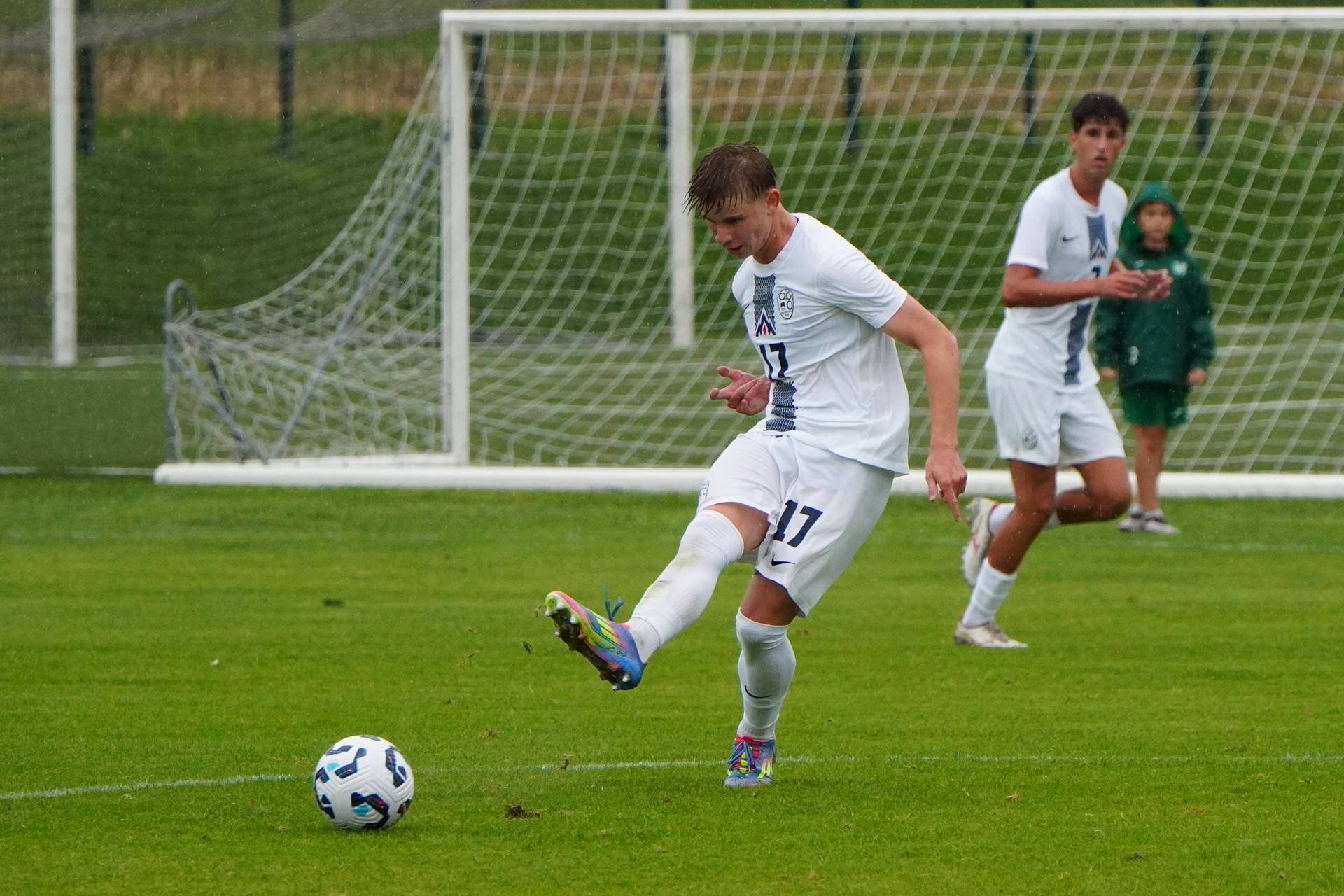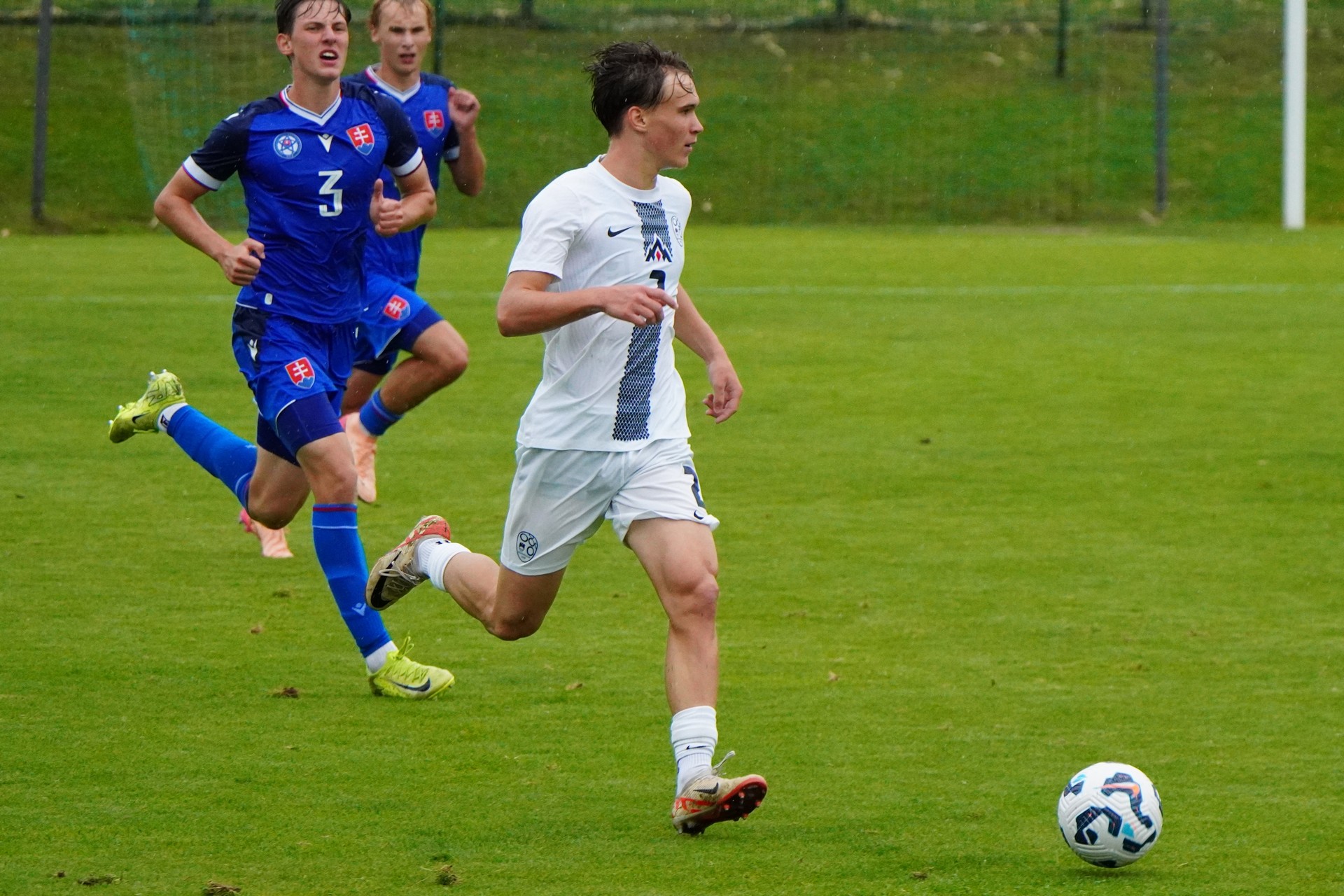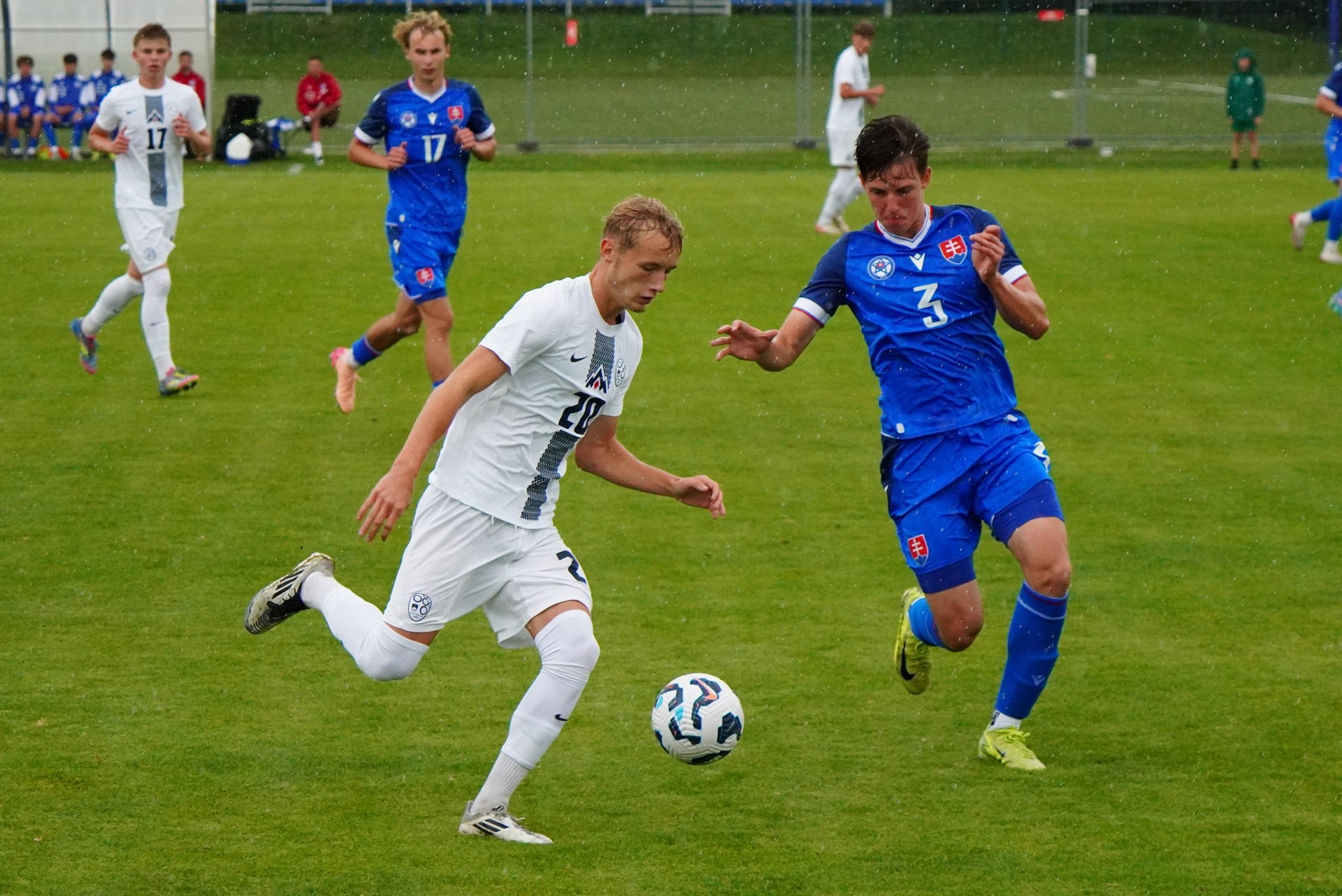 Slovaki so bili po napaki slovenske obrambe nevarni že v uvodni minuti, po strelu Lea Hofstadterja pa se je izkazal vratar Rene Pirih. Gostitelji srečanja so odgovorili v četrti minuti. Po predložku Tristana Kotarja je z glavo poskušal David Jereb, veselje pa mu je preprečil Dušan Perniš. Slovenija se je v zaostanku znašla v 12. minuti, ko so gostje prišli do kazenskega udarca, izkoristil pa ga je Matuš Tomaško.