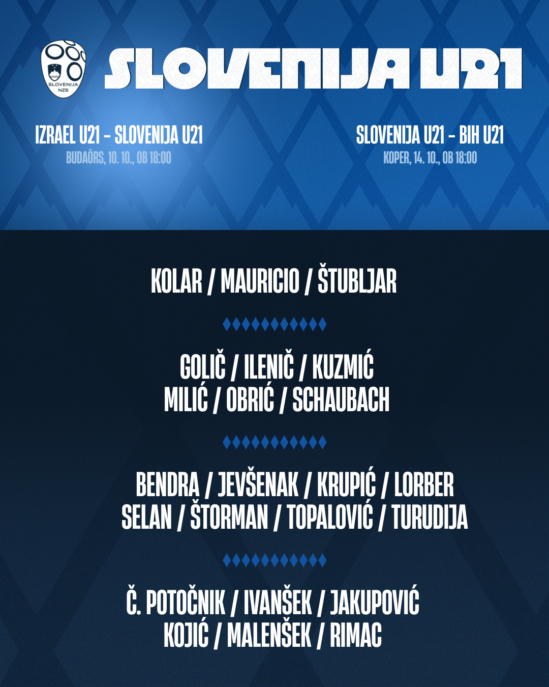 Kot že zapisano, sta pred zasedbo selektorja Andreja Razdrha dve kvalifikacijski tekmi. Reprezentanca Izraela bo srečanje gostila v madžarskem Budaörsu, dvoboj v predmestju Budimpešte pa bo odigran za zaprtimi vrati. V torek, 14. oktobra, se bodo Slovenci prvič v aktualnem kvalifikacijskem ciklusu predstavili še pred domačim občinstvom. Mlada reprezentanca Slovenije se bo na zelenici koprske Bonifike pomerila s staro znanko Bosno in Hercegovino, ki je bila tekmica tudi v prejšnjem kvalifikacijskem ciklusu. Slovenci so bili boljši tako v Sarajevu kot Murski Soboti.