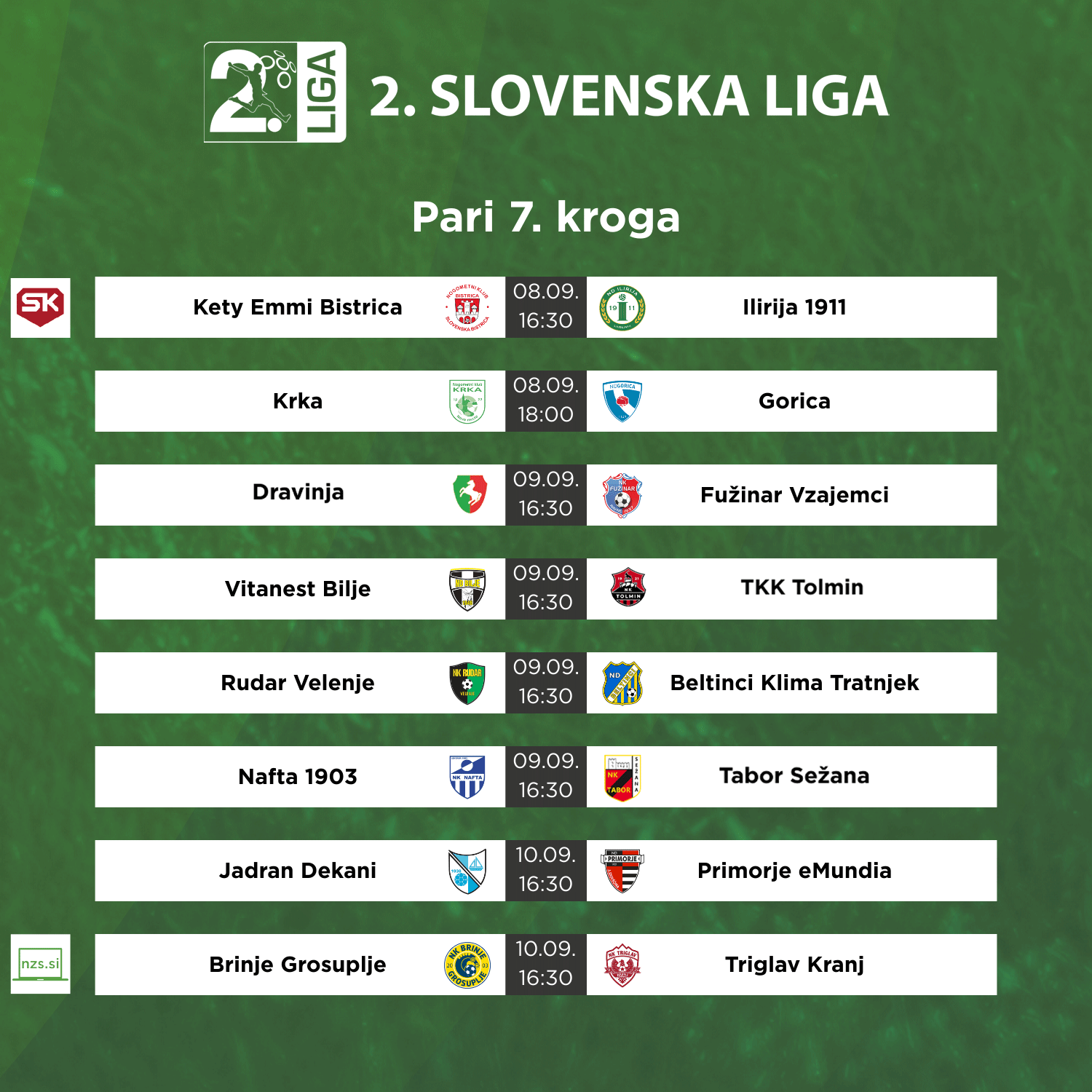Za drugoligaše ni reprezentančnega premora, že v petek se pričenja sedmi krog 2. SNL. Krog bosta s tekmo pred kamerami Sportkluba odprla Bistrica in Ilirija, vodilni Grosupeljčani pa se bodo v nedeljo pomerili s Kranjčani, dvoboj prve in tretje ekipe prvenstva si boste lahko ogledali v prenosu na spletni strani NZS.