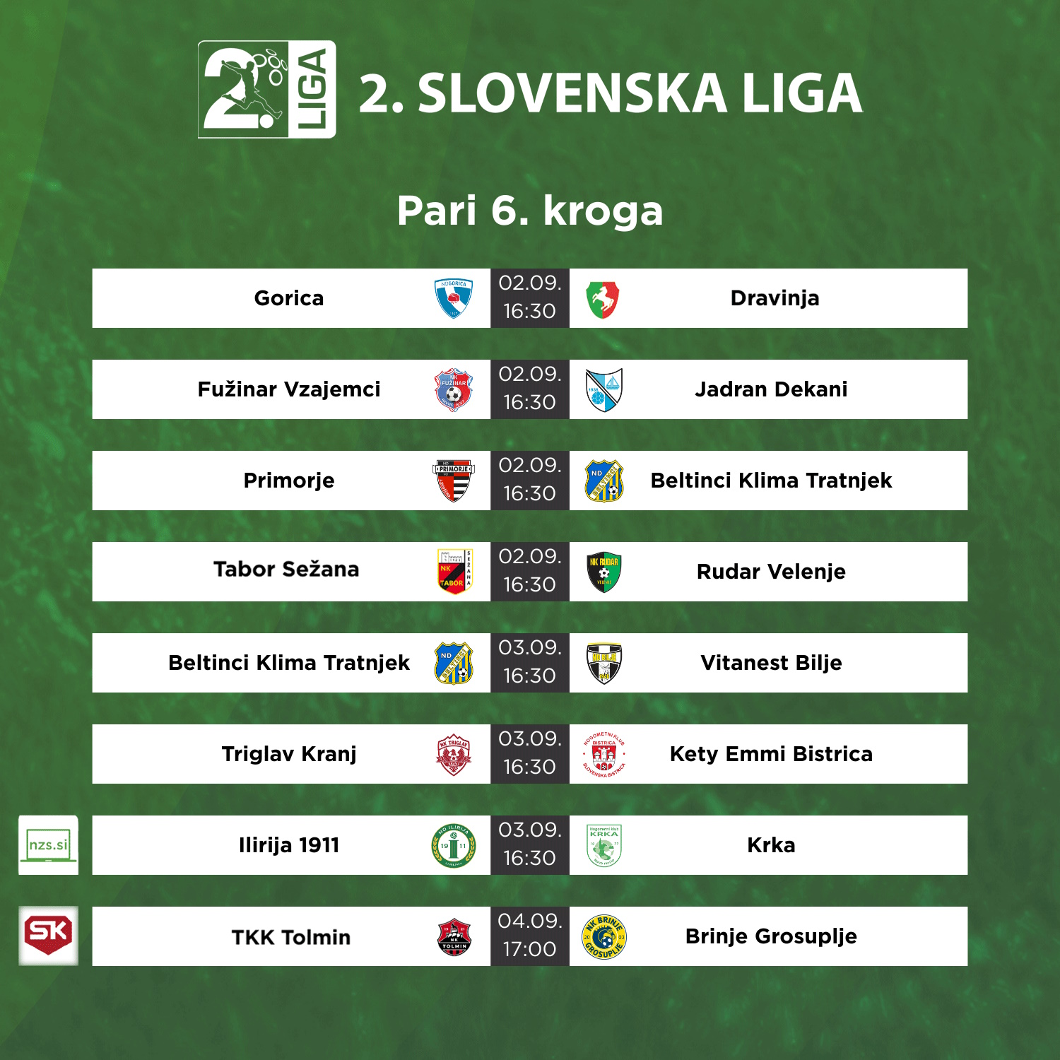 Drugoligaši so avgust zaključili s tekmami preloženega drugega kroga, v september vstopajo s šestim krogom. S ponedeljkovim gostovanjem v Tolminu, pri svojem bivšem trenerju Sanelu Konjeviću, ga bodo zaključili vodilni Grosupeljčani, dvoboj pa si boste lahko ogledali v prenosu Sportkluba. Pred kamero NZS se bosta pomerili ekipi Ilirije in Krke.