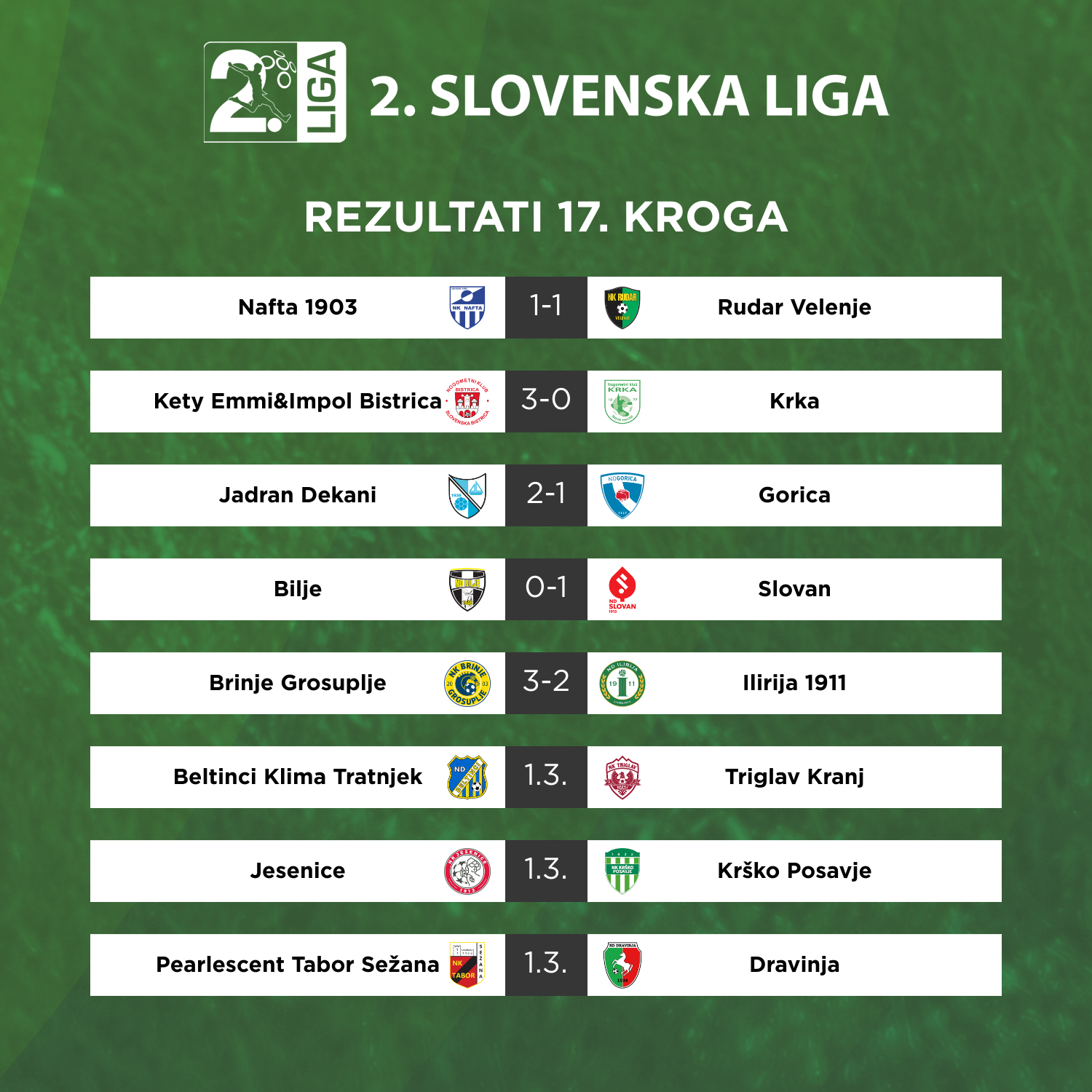 1:0 Kos (5.), 2:0 Ložar (5.), 3:0 Vrabel (6.), 3:1 Žvokelj (18.), 4:1 Tanšek (30.), 5:1 Vrabel (33.), 6:1 Trdan (35.), 2:6 Žvokelj (40.)