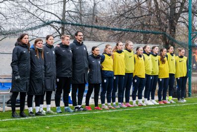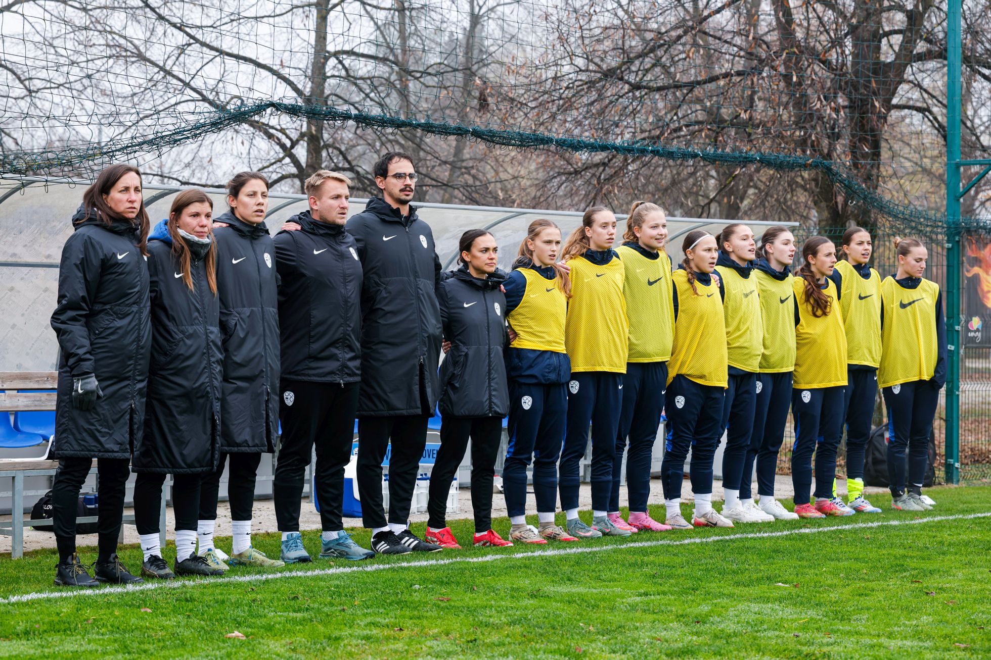 Varovanke selektorice Anje Milenkovič so se dobro pripravile na zadnjo tekmo kvalifikacijske skupine B6. Do 31. minute so bile enakovreden tekmec – že v 3. in 13. minuti sta bila strela Tjaše Krajnc in Nelle Gjergjek blizu vodstvu. V 31. minuti pa je Krajnc prejela drugi rumeni karton in bila izključena. Kljub številčni slabosti so naše igralke še naprej uspešno kljubovale gostjam. Selektorica Milenkovič je med drugim v igro poslala Gajo Pintar, ki je zamenjala Elo Velišček in tako prilagodila postavitev zaradi manjka igralke.