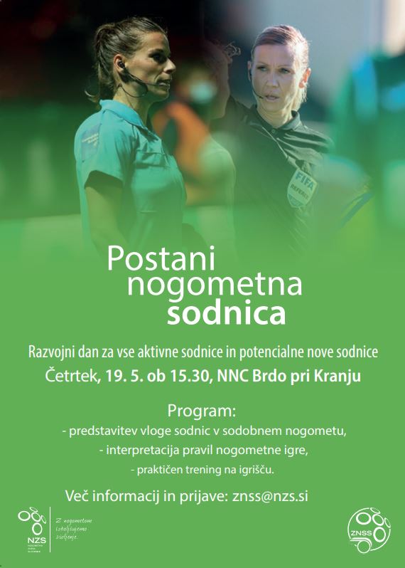 V četrtek 19. maja pri Zvezi nogometnih sodnikov Slovenije organiziramo Razvojni dan za vse obstoječe ženske sodnice in vsa dekleta, ki si želijo postati sodnice, zato če imaš rada nogomet in izzive se preizkusi v vlogi sodnice in pridi v četrtek na Ženski sodniški dan v nacionalni nogometni center na Brdu pri Kranju, predoslje 40a, 4000 Kranj.