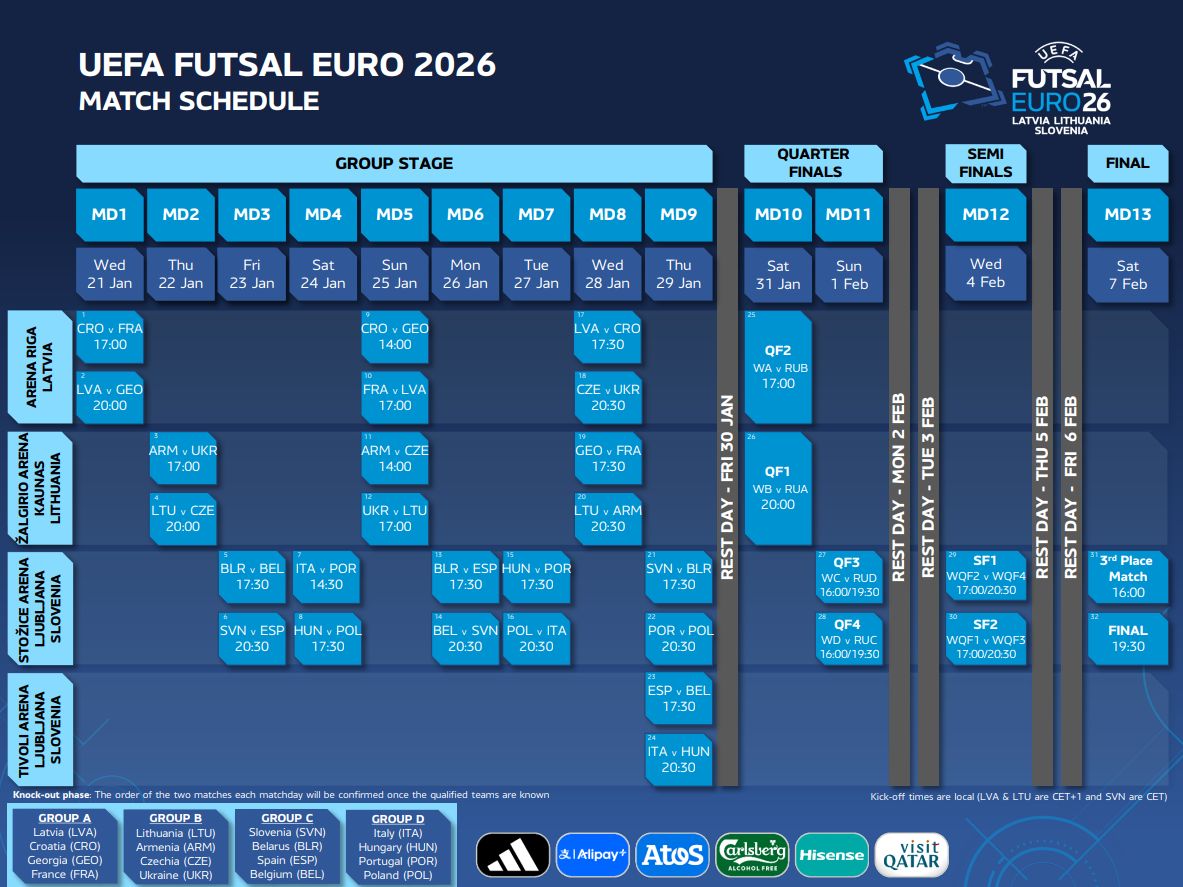 Žreb za UEFA Futsal EURO 2026 bo potekal v petek, 24. oktobra 2025, ob 11. uri v amfiteatru Žalgiris Arene v Kaunasu v Litvi, spletni prenos pa bo na Youtube kanalu Nogometne zveze Slovenije in spletni strani Nzs.si.